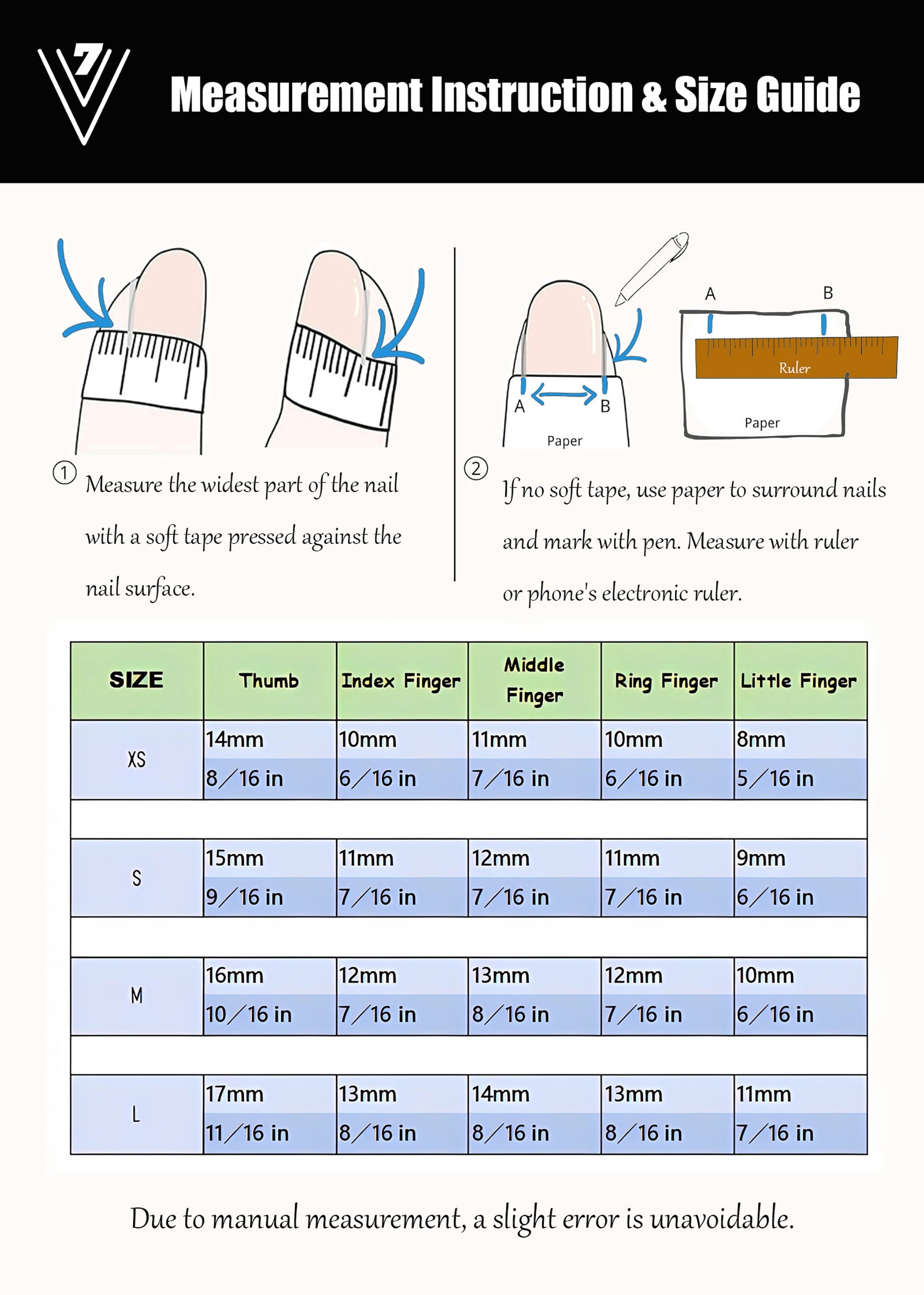 Please refer to our measurement instructions as pictured in the listing photos. Before you place an order, measure all nails of yours.