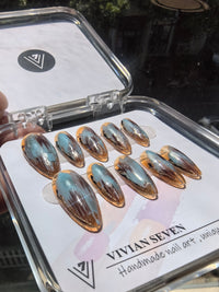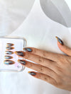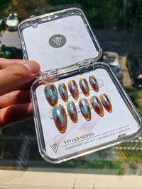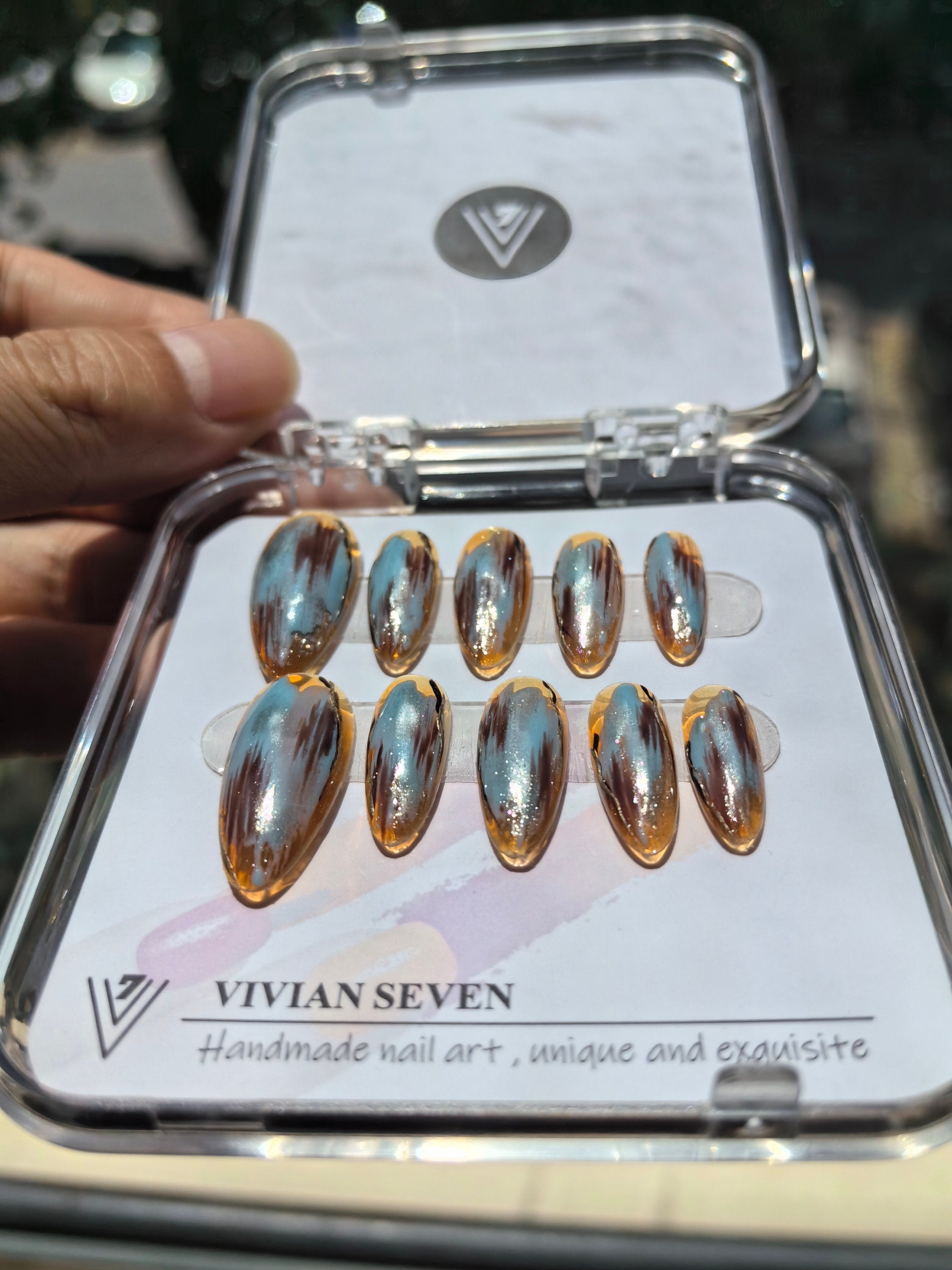 The entire production process is carried out by hand. It primarily involves intricate hand painting, starting with careful nail polishing, followed by the application of base gel, double layers of nail polish gel, and the addition of other elements such as magic mirror powder, fine line drawing gel and sculpting gel, depending on the design. Finally, the nails are reinforced and sealed to ensure long-lasting perfection.