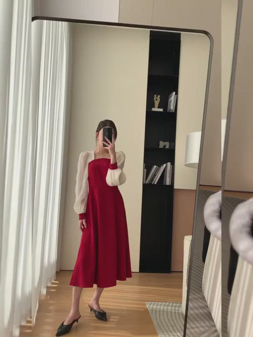 Patchwork Chiffon Sleeve Fit & Flare Red Dress