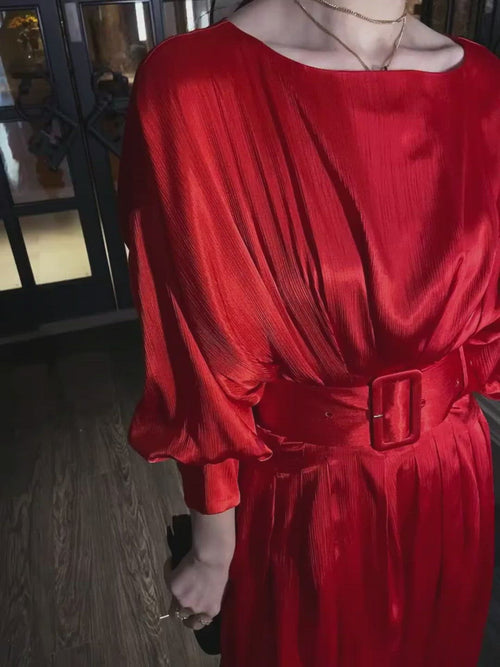 Women Red Satin Pleats Long Midi Formal Gown Dress