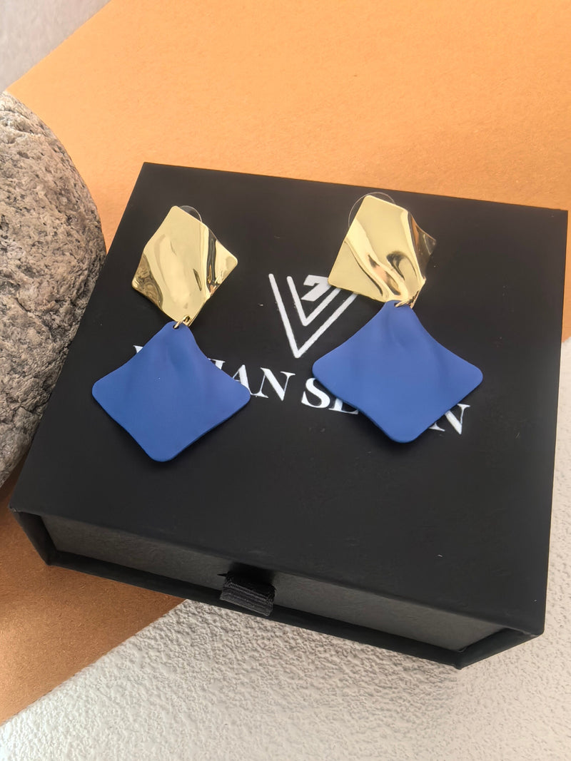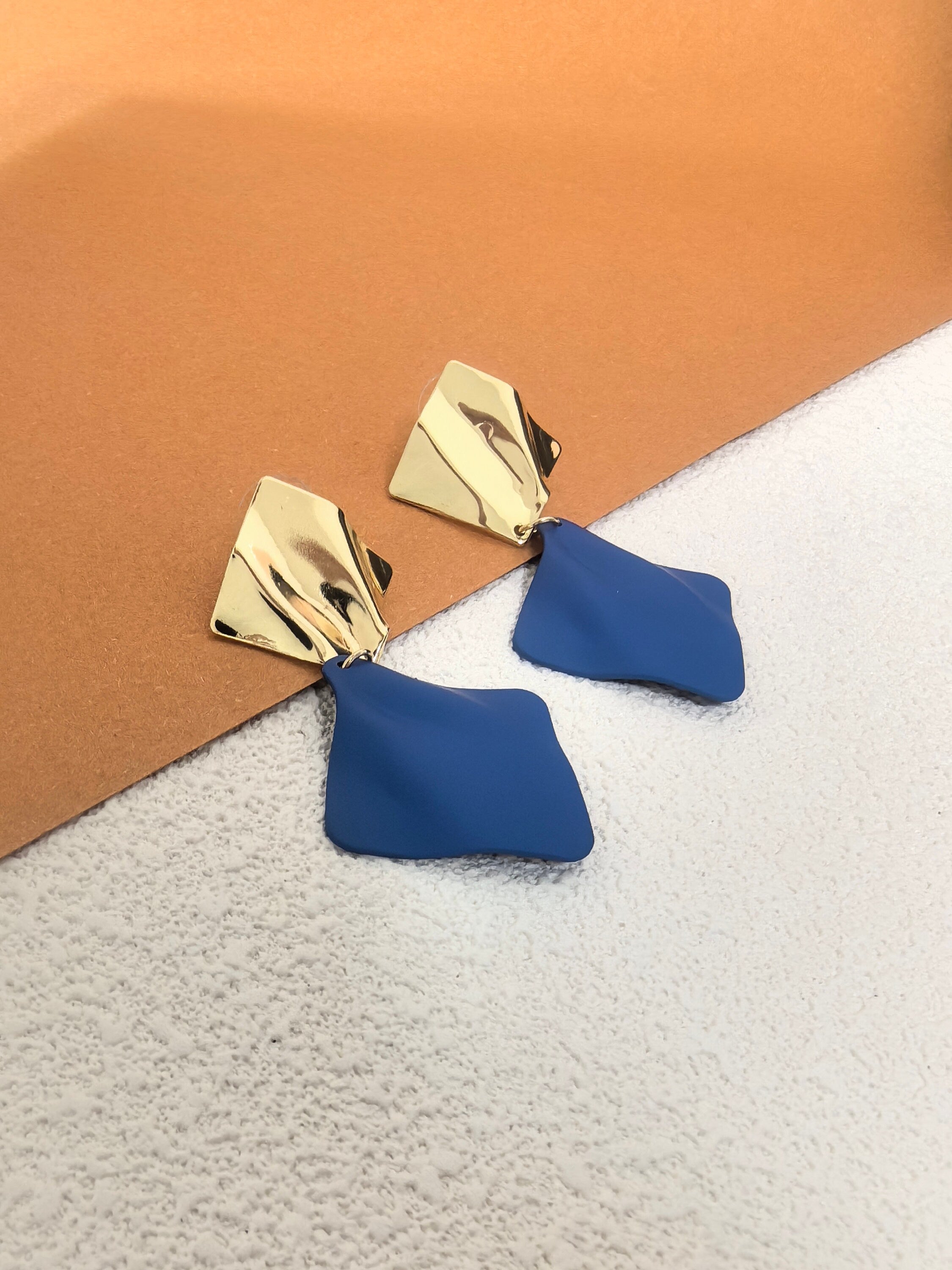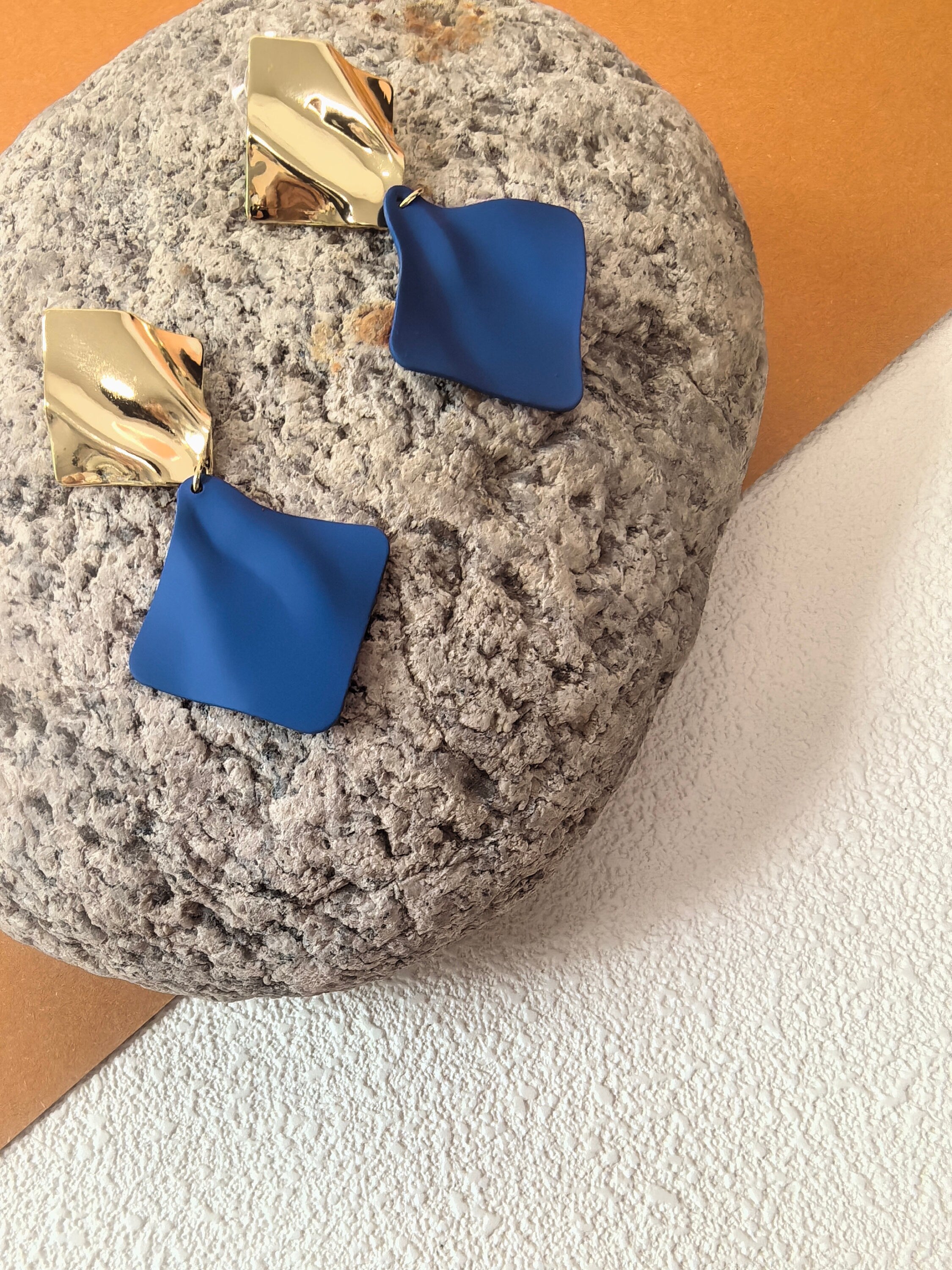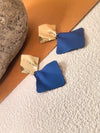 Geometric Gold Blue Two Tone Metal Square Wavy Crumpled Drop Statement Earrings