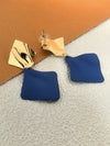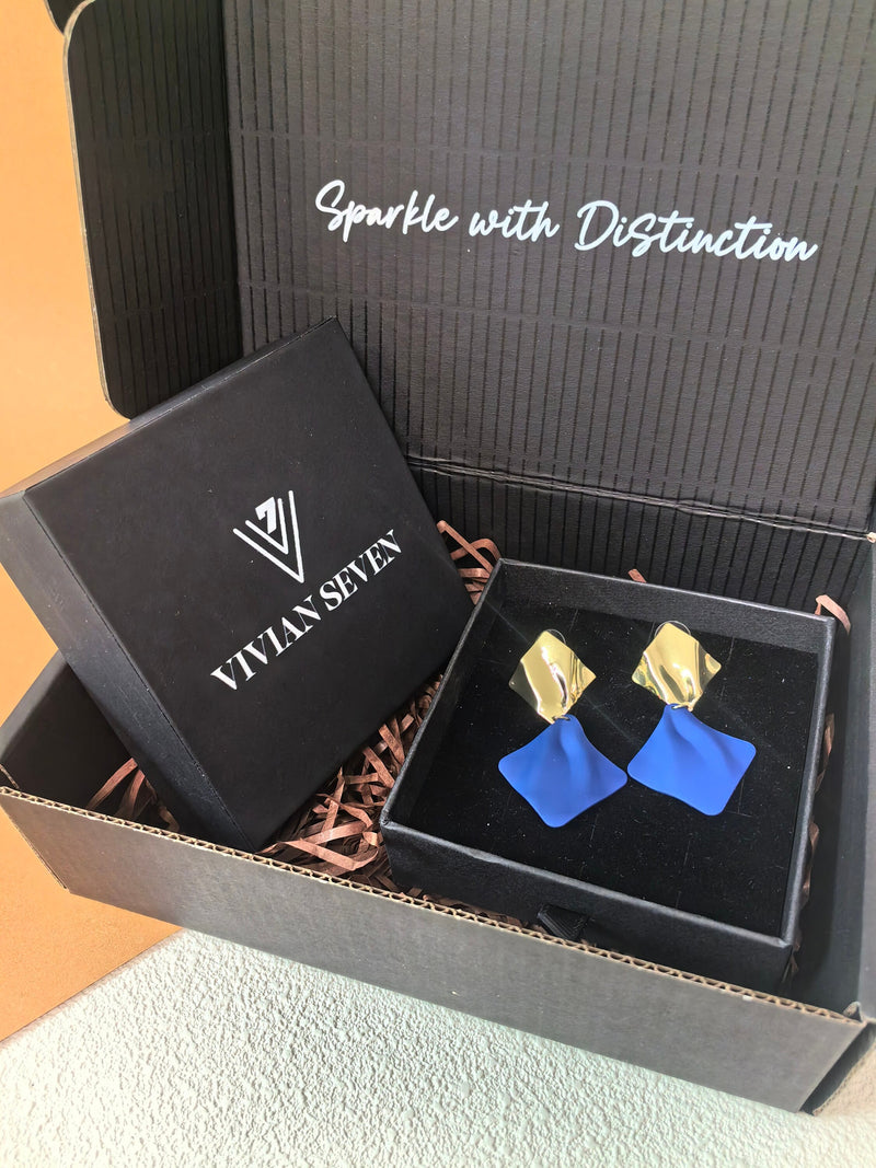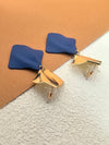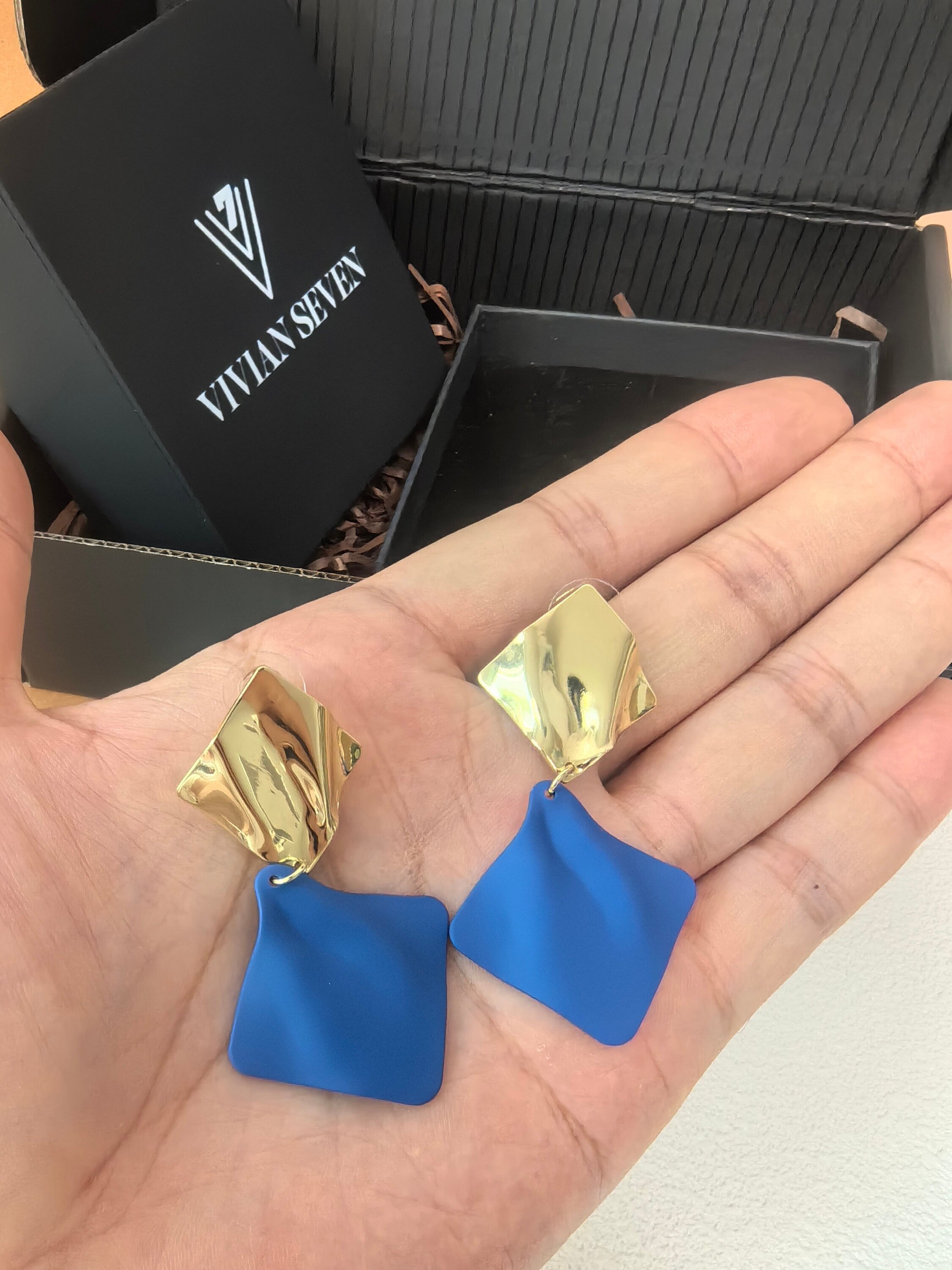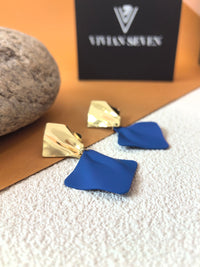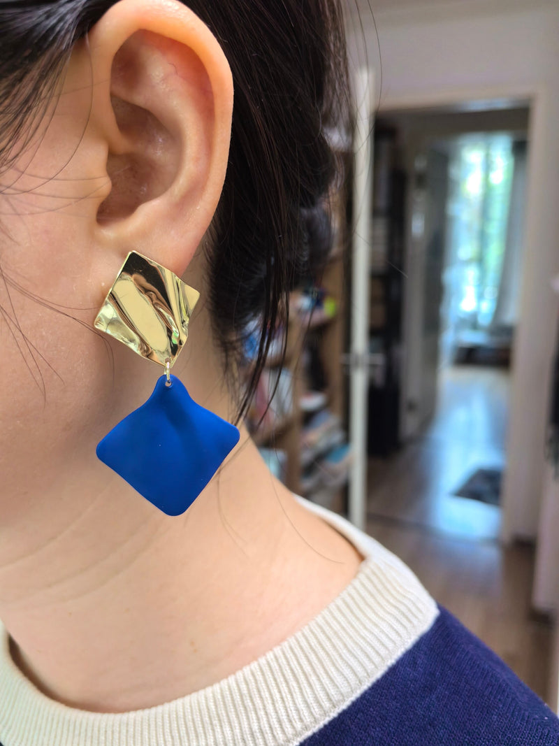 Geometric Gold Blue Two Tone Metal Square Wavy Crumpled Drop Statement Earrings