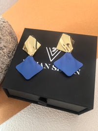 Add a statement to your style with these Two Tone Metal Square Wavy Earrings. Crafted from a combination of blue and golden metal, these earrings are sure to catch attention. Perfect for women who want to add a touch of quirkiness to their jewelry collection.