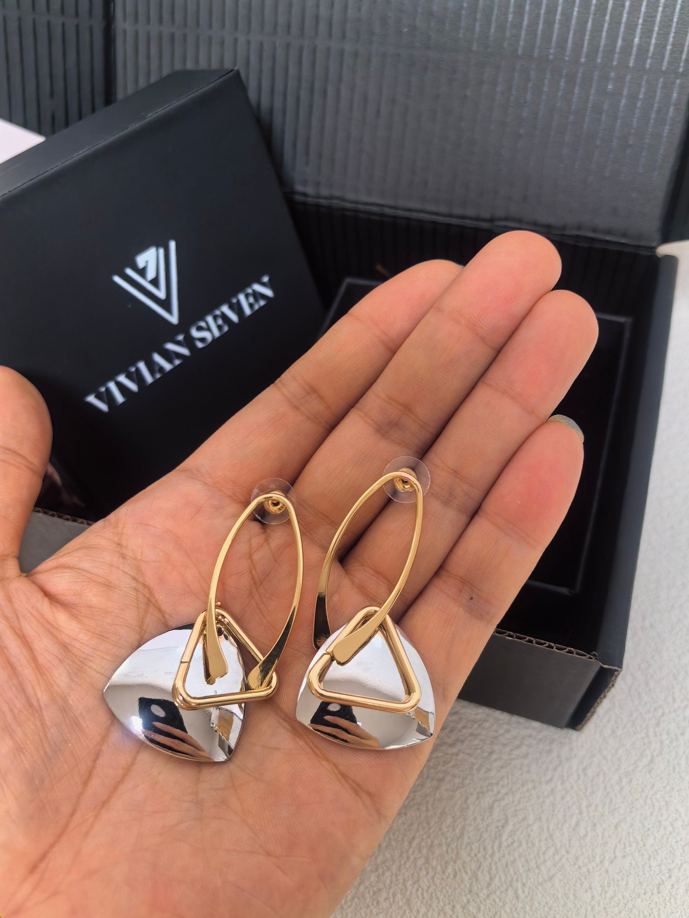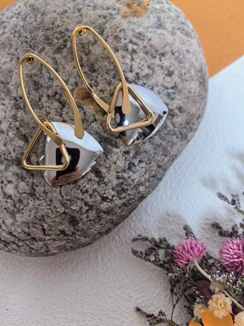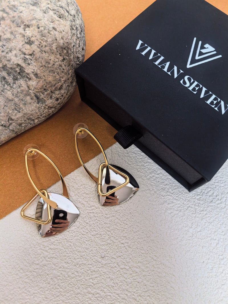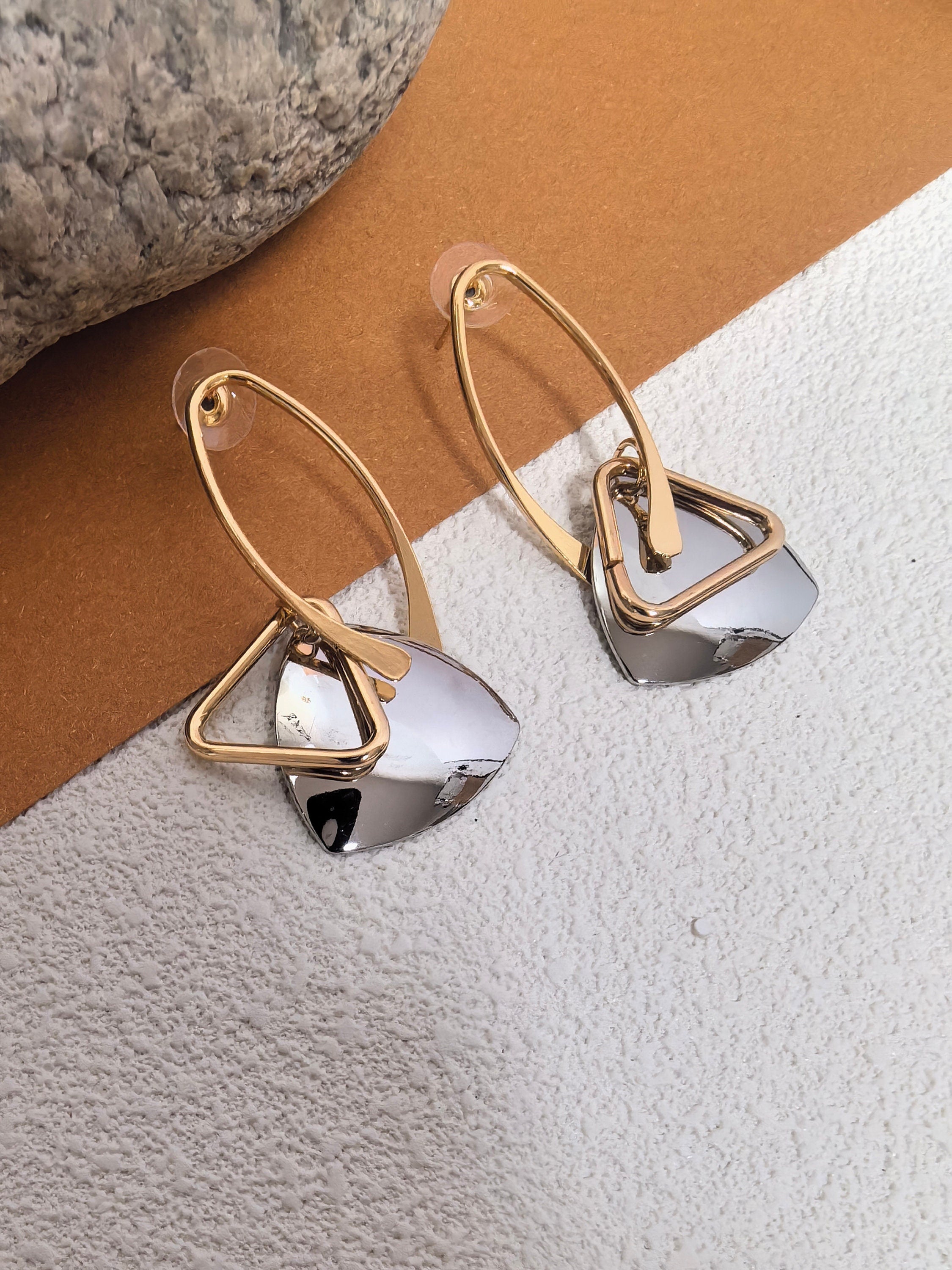 Introduce an essence of elegance with our Geometric Oval Triangle Statement Earrings. Featuring a unique blend of geometric shapes, these earrings add a touch of sophistication to any outfit. Crafted with premium materials, these earrings are a must-have for any fashion-forward individual. Elevate your look with these exclusive earrings.