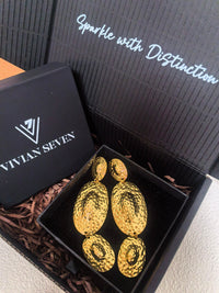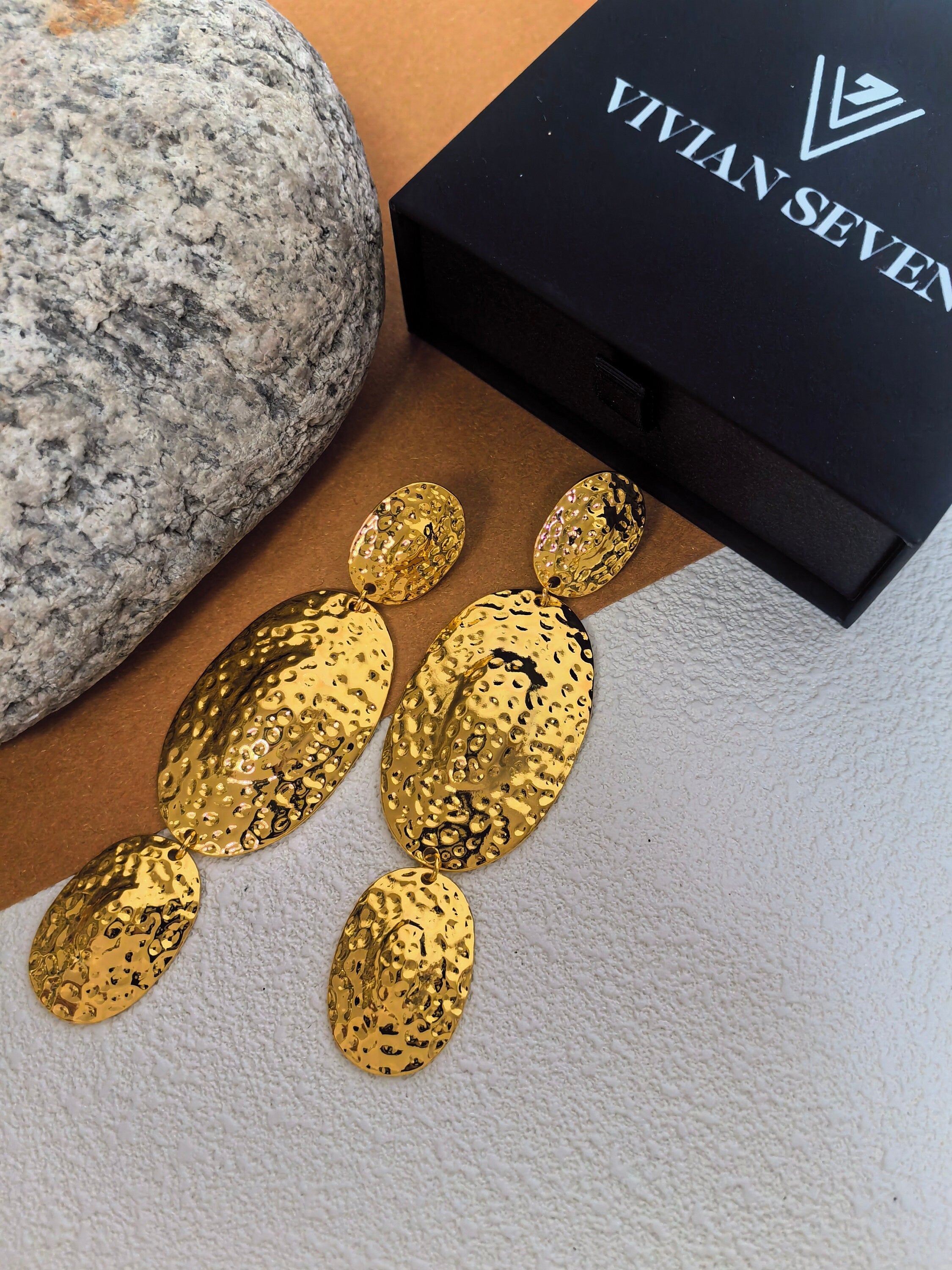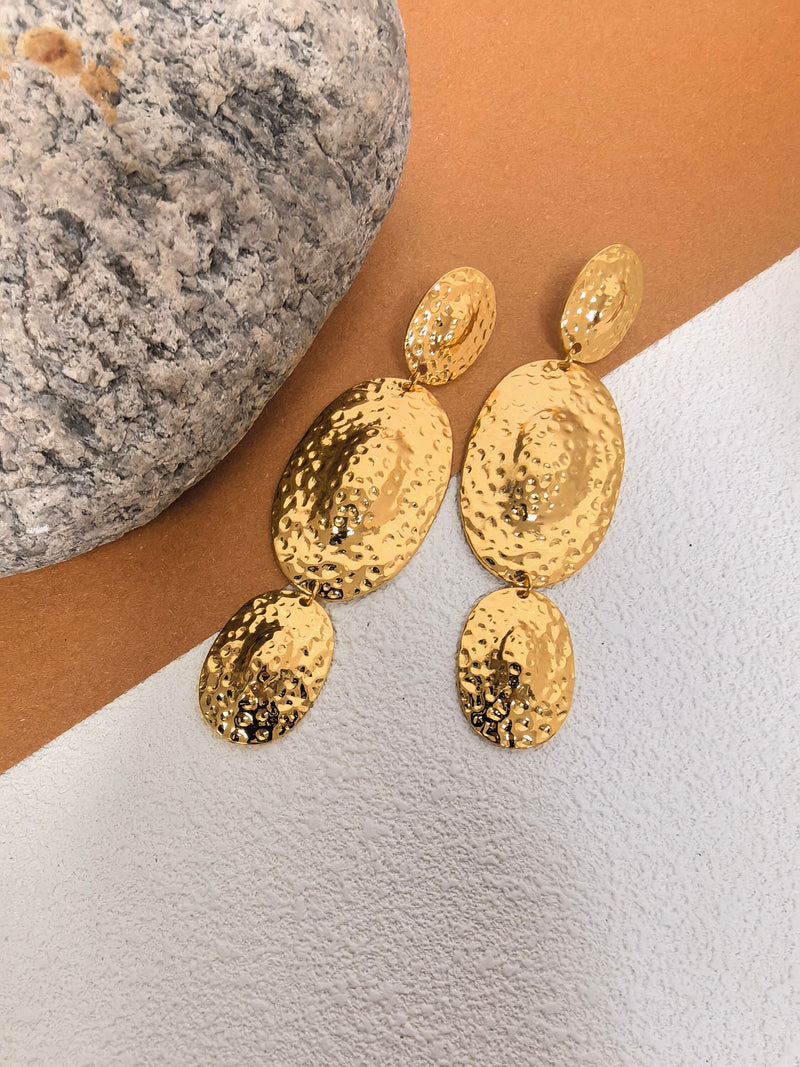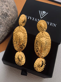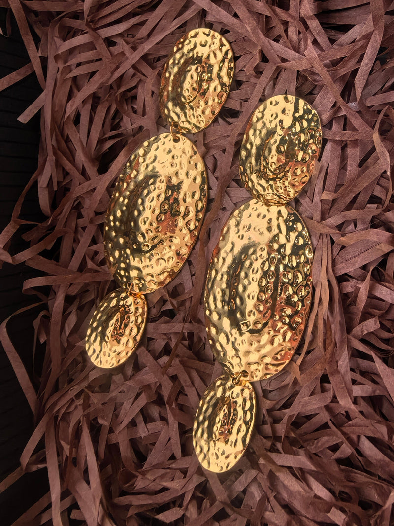 Adorn your ears with these luxurious Gold Hammered Oval Disc Drop Earrings. Exquisitely handcrafted with 3 elegantly detailed oval metal discs, these statement earrings are perfect for sophisticated women who appreciate fine jewelry. Elevate your style and make a statement with these exclusive earrings.