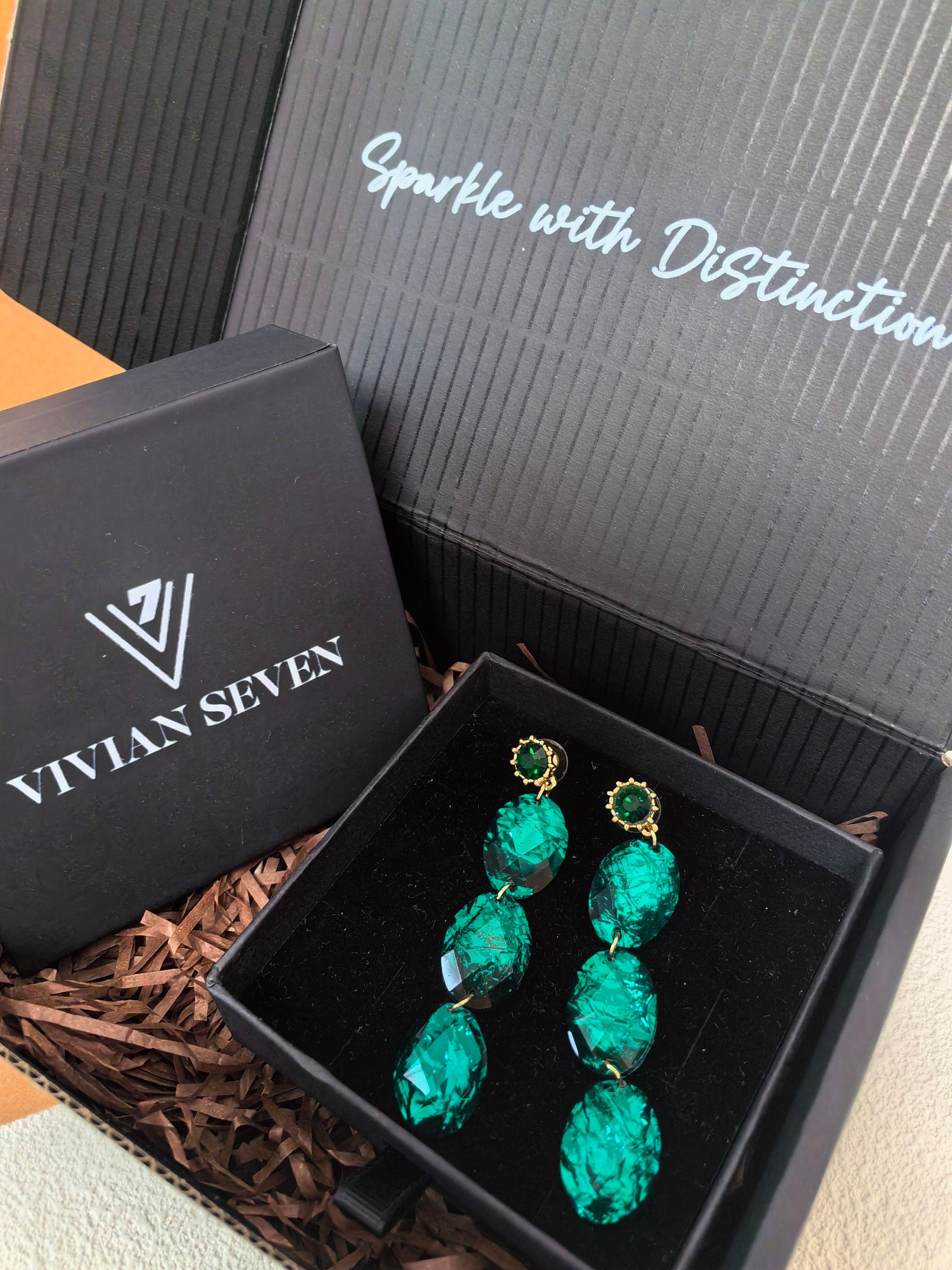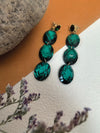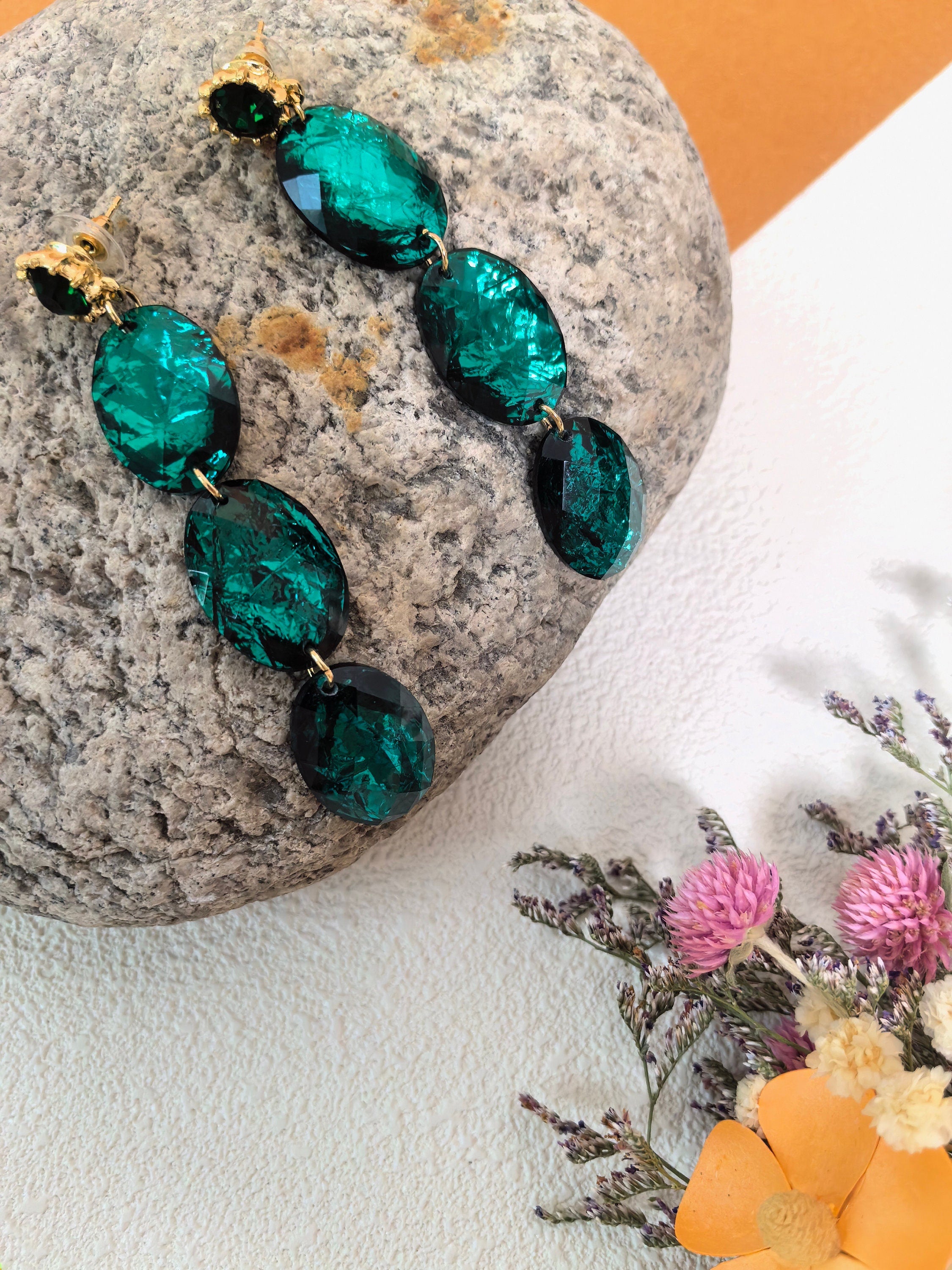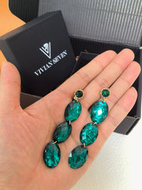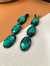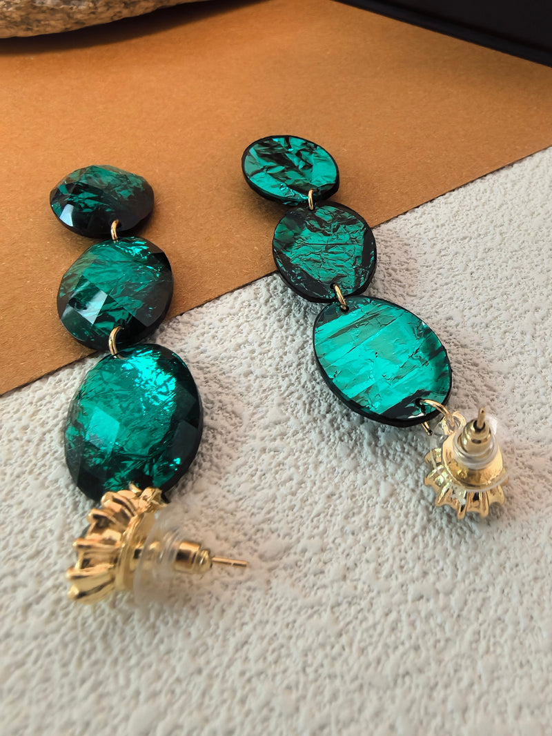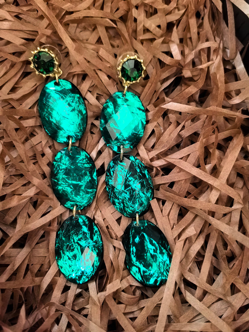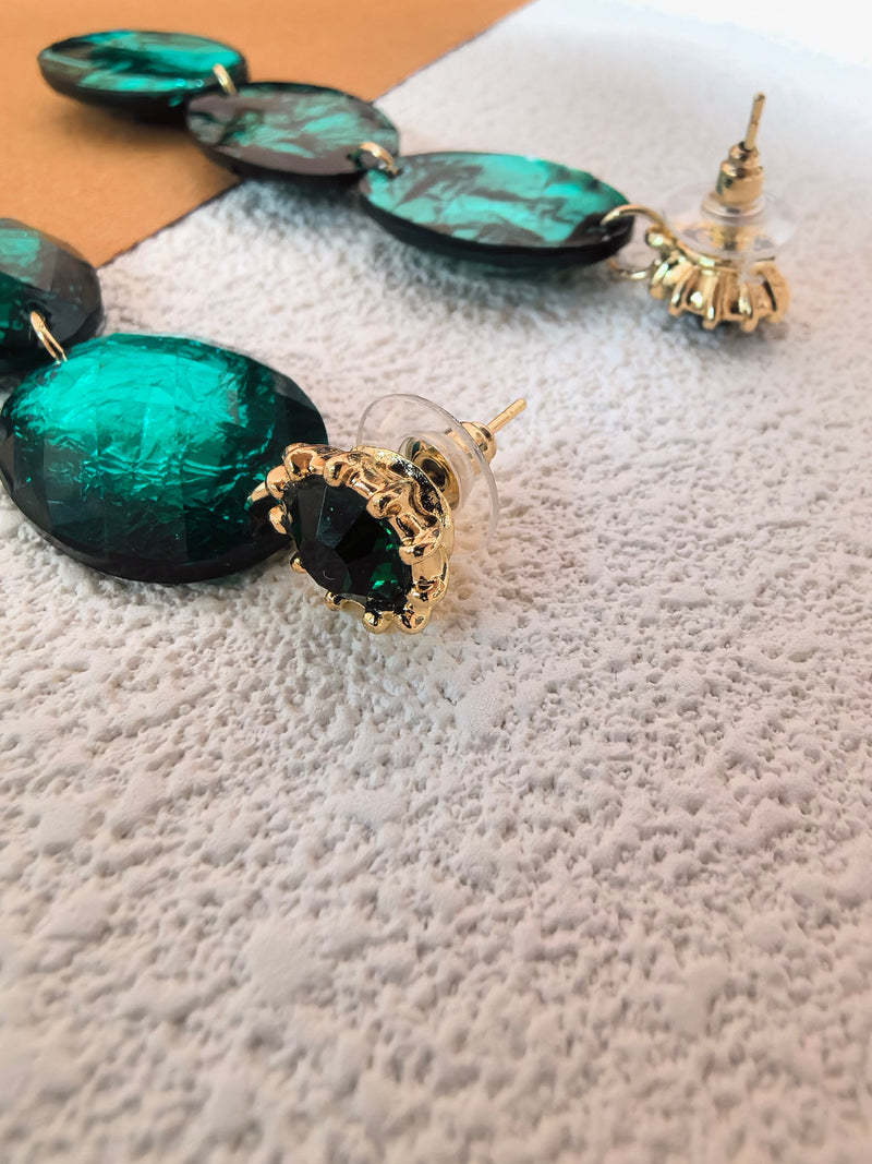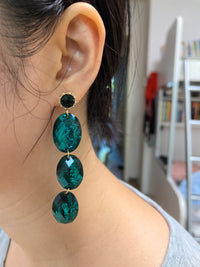 Green Triple Acrylic Rhinestone Stone Oval Linear Drop Dangle Statement Earrings