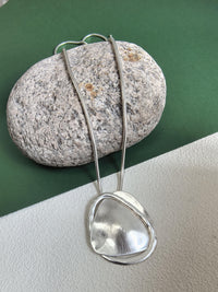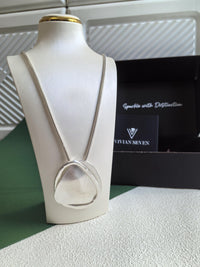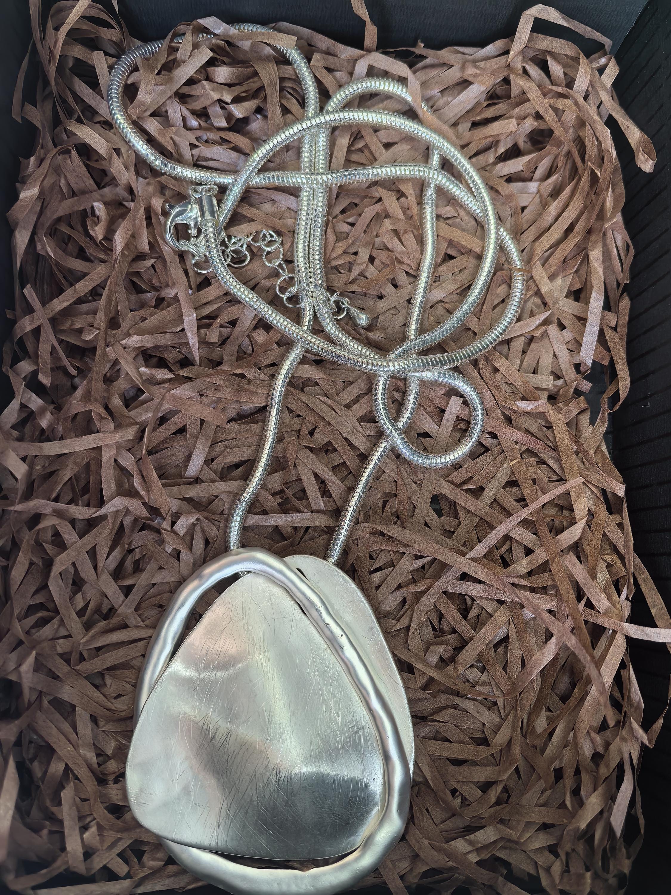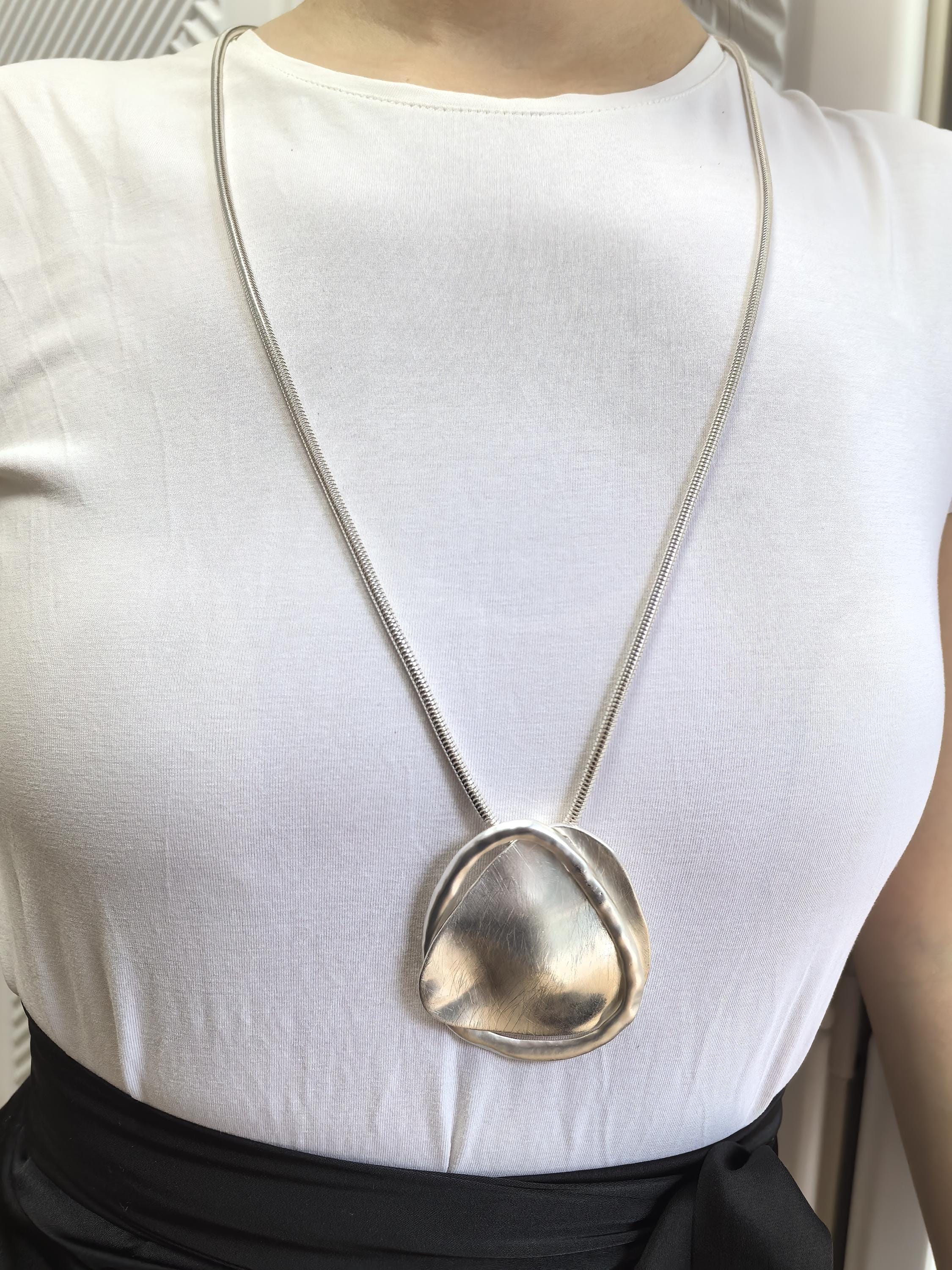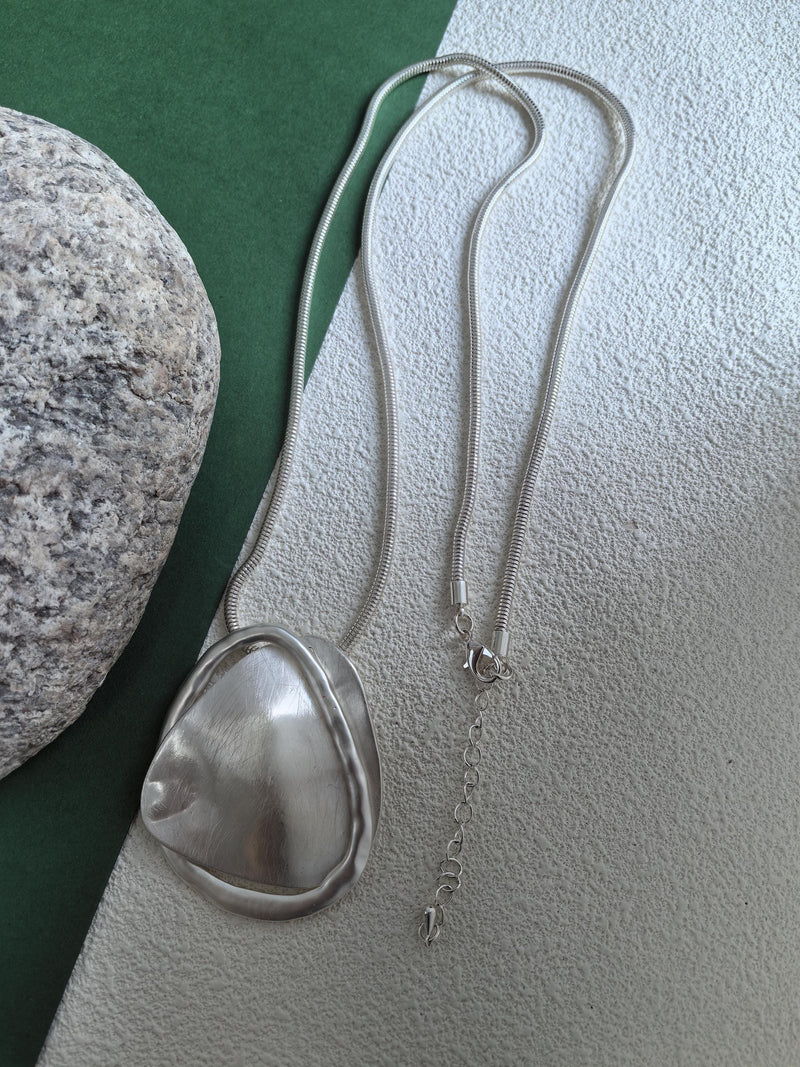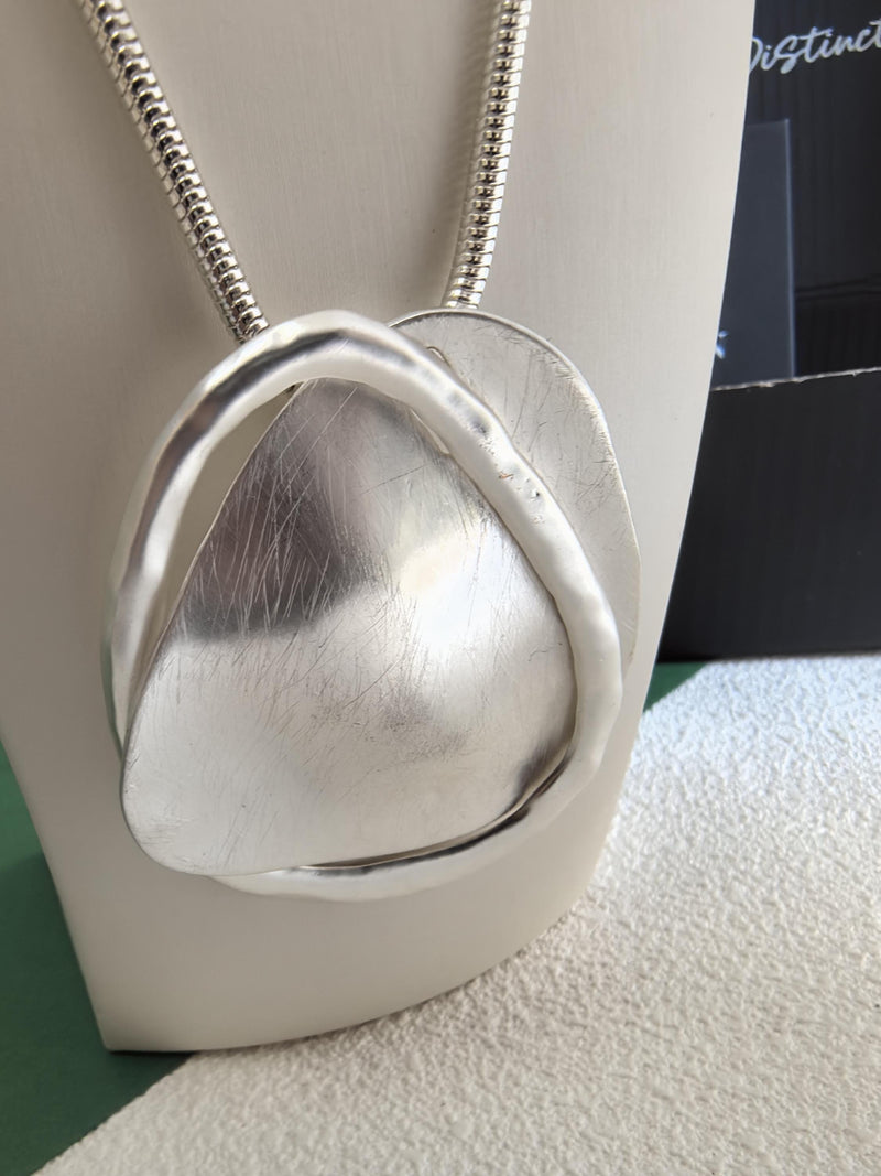 Long Silver Snake Chain Scratched Metal Geometric Patchwork Large Pendant Statement Necklace