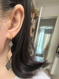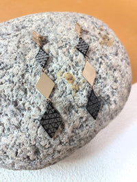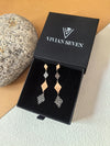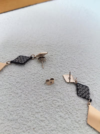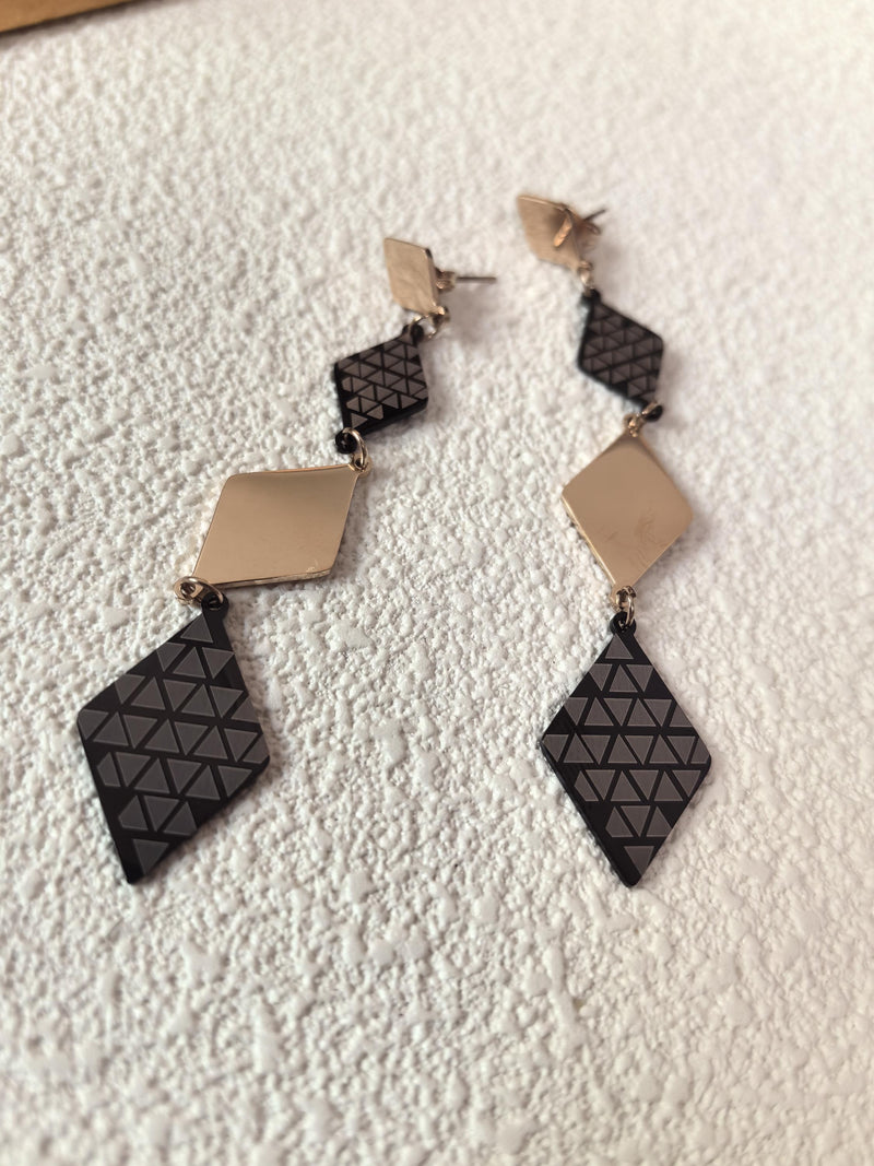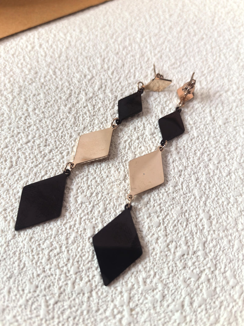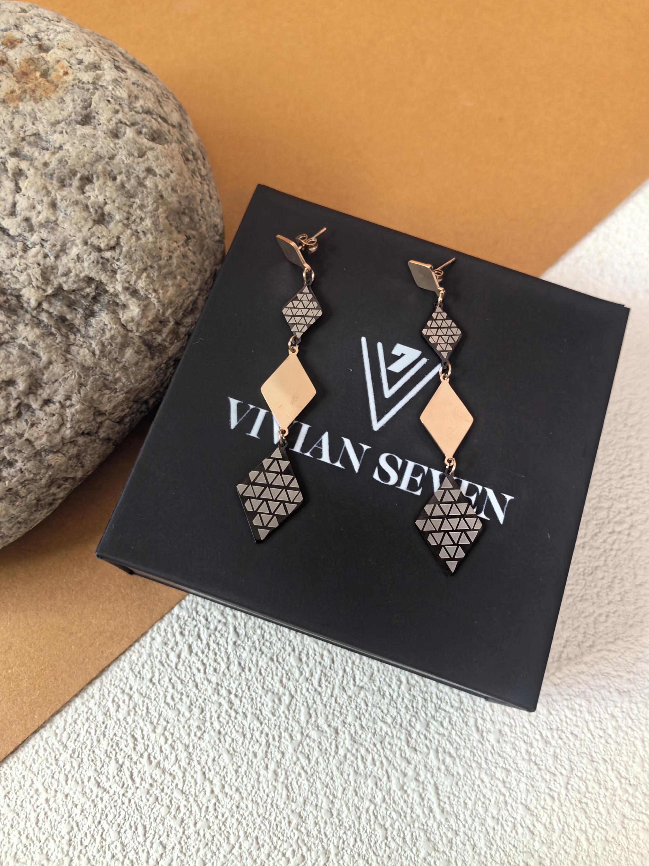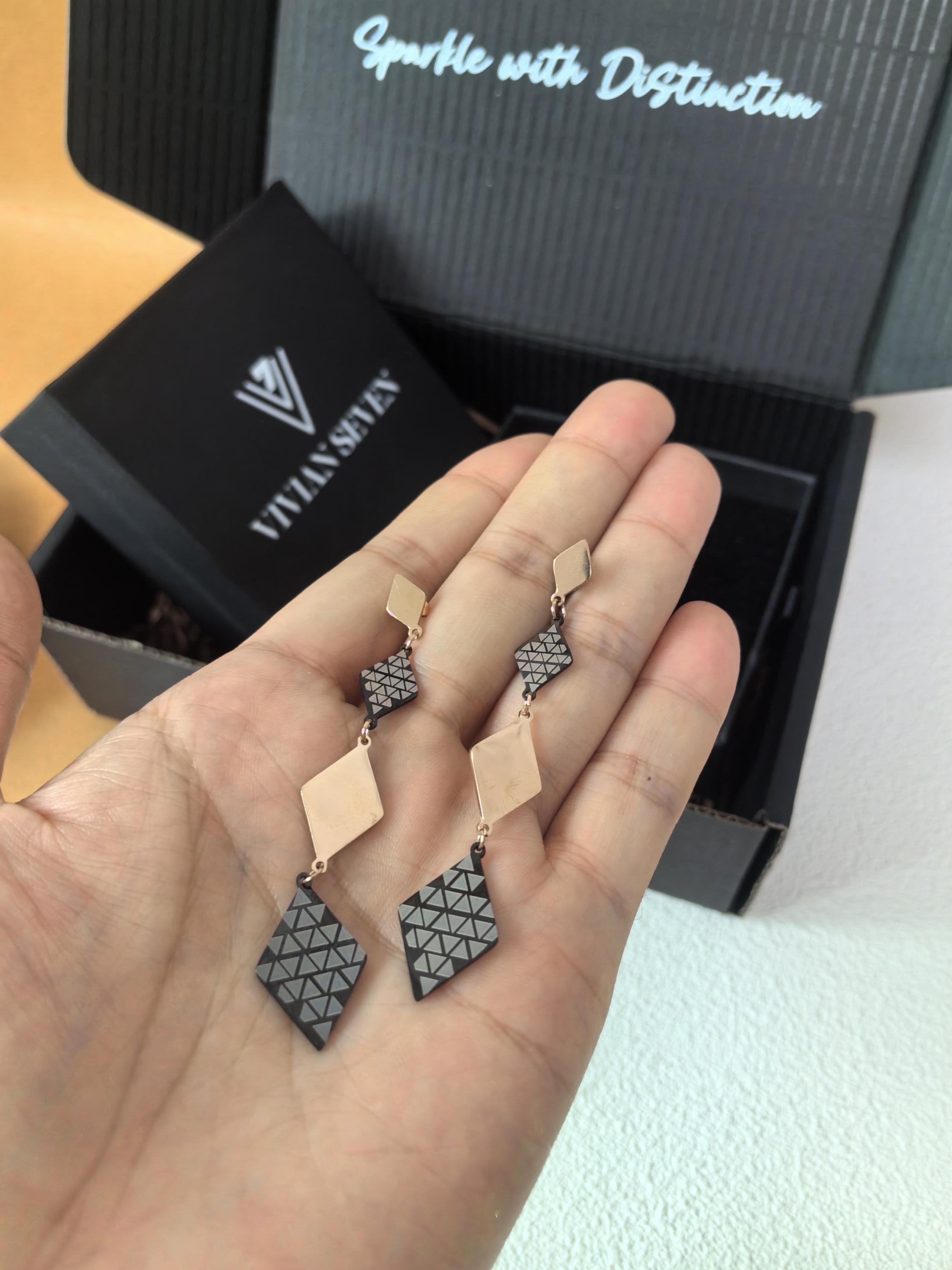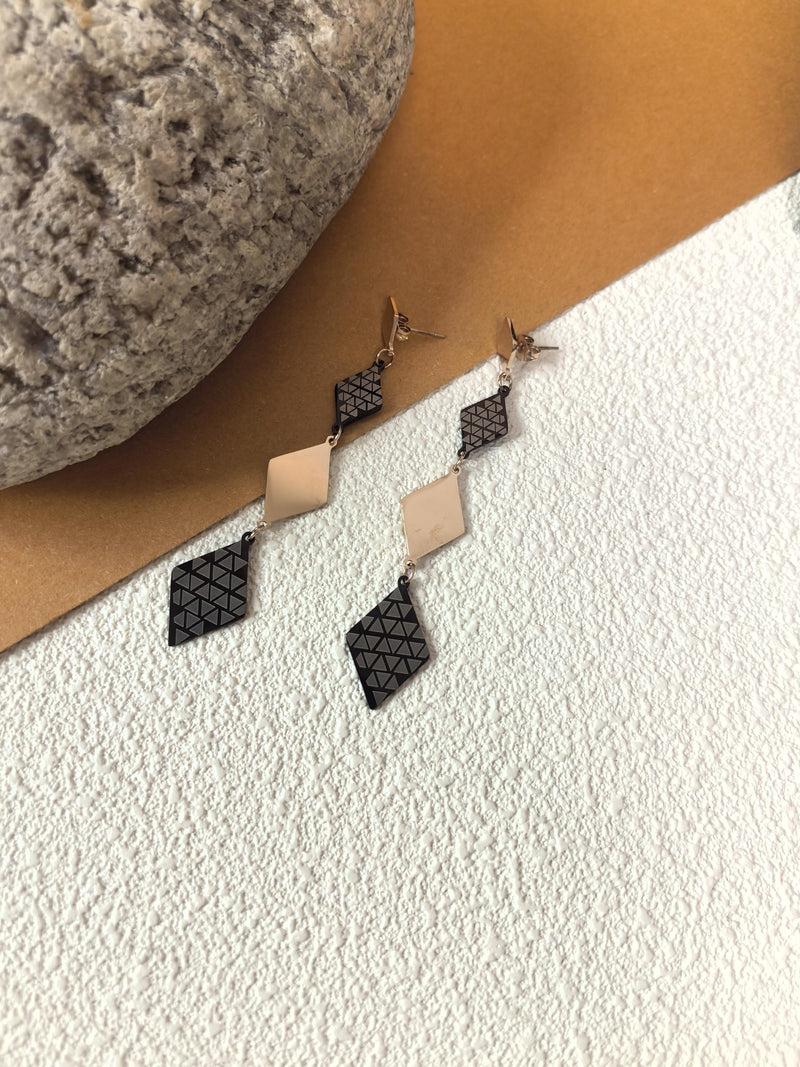 Introducing our luxurious linear earrings, crafted with titanium steel for timeless elegance. The rose gold and black rhombus discs create a statement drop, perfect for any occasion. Elevate your jewelry collection with these sophisticated dangle earrings, designed exclusively for women with refined taste.