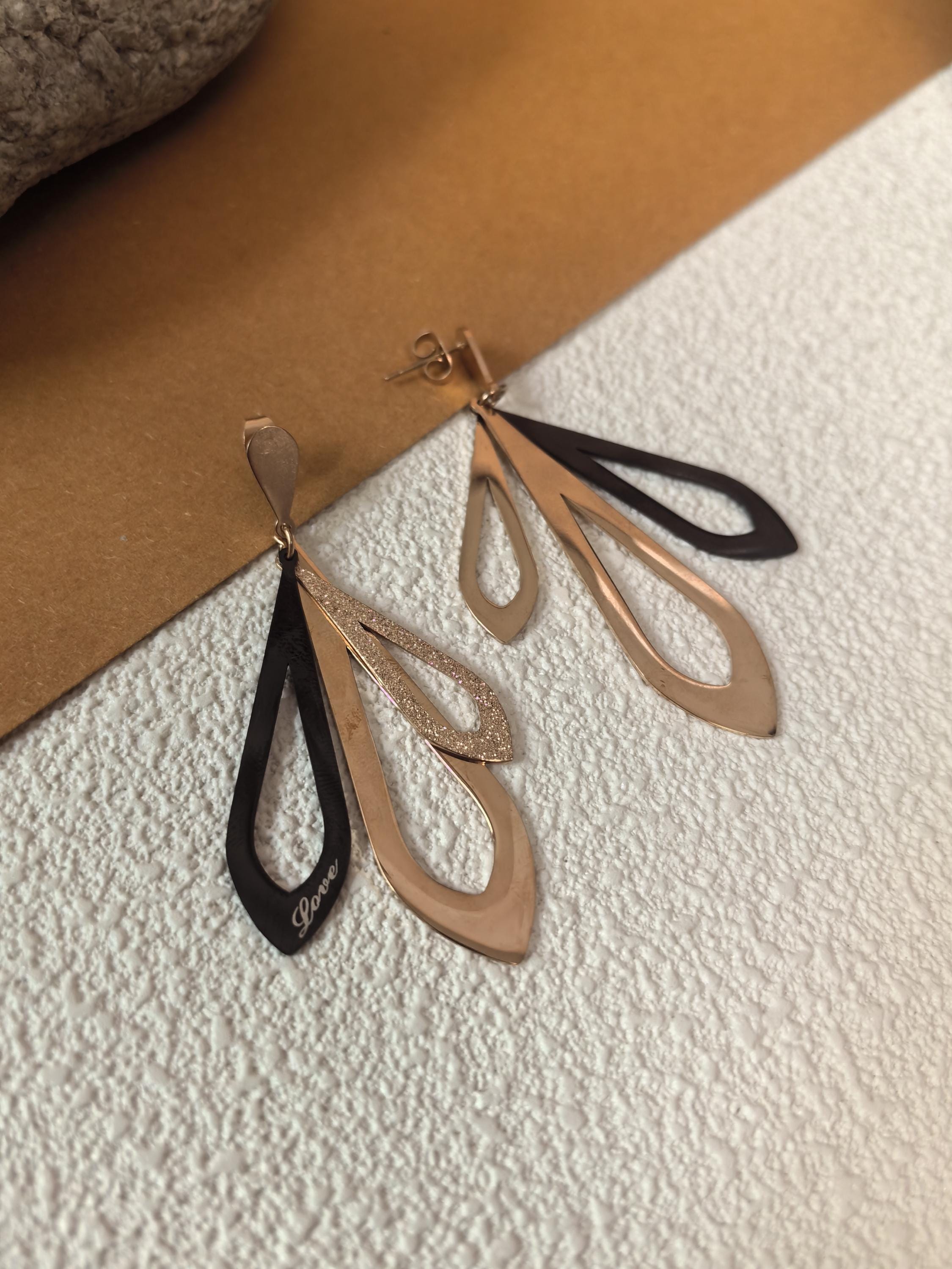 Titanium Steel Rose Gold Black Love Drop Linear Dangle Statement Earrings