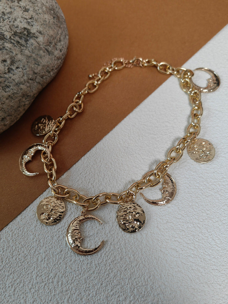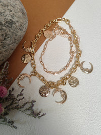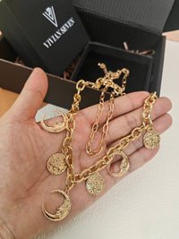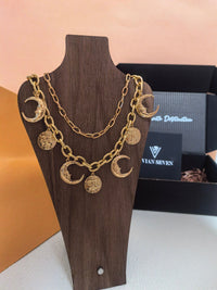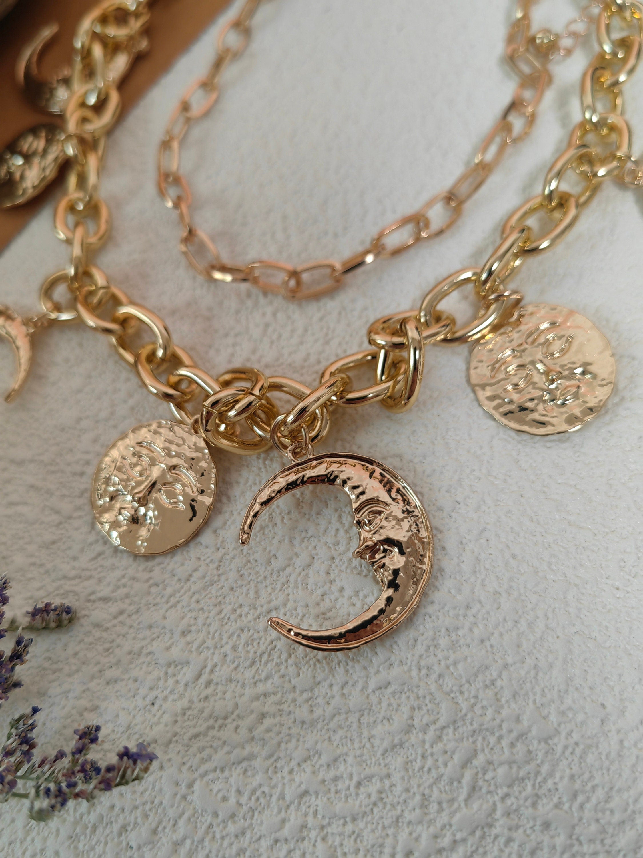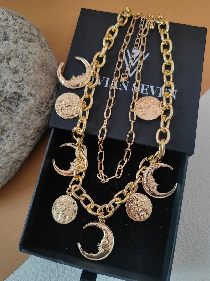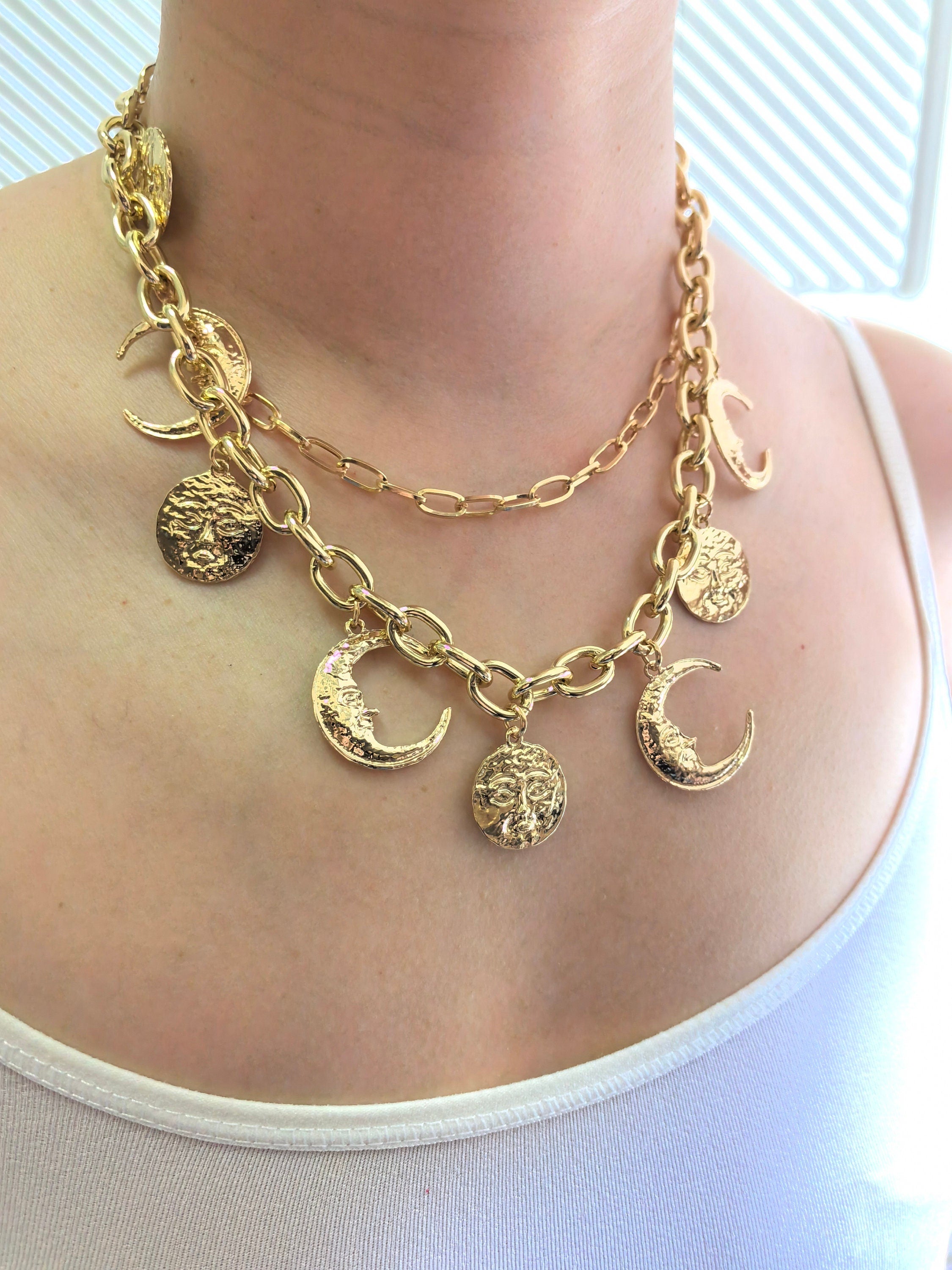 Double Strand Gold Sun & Moon Charms Layered Necklace