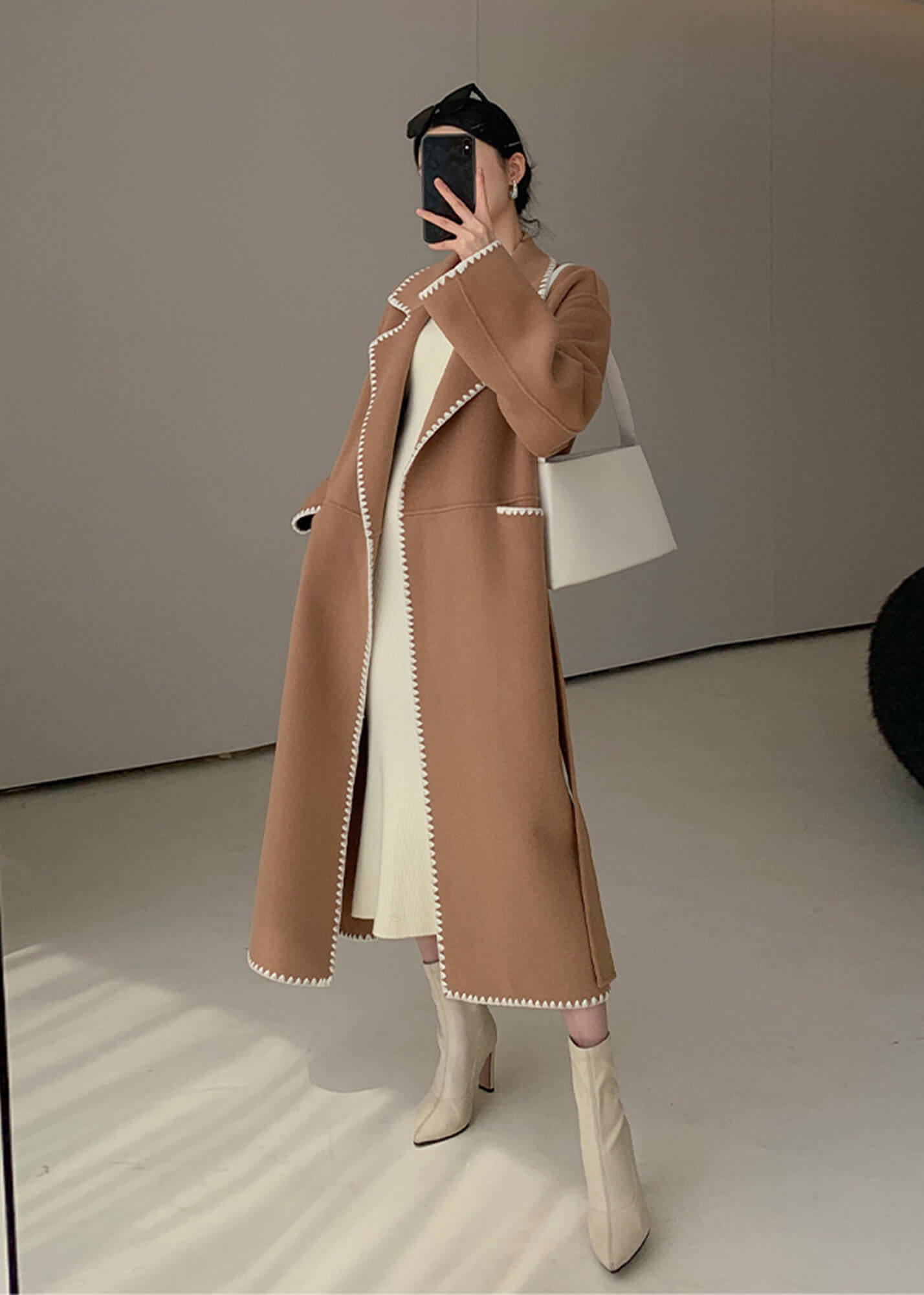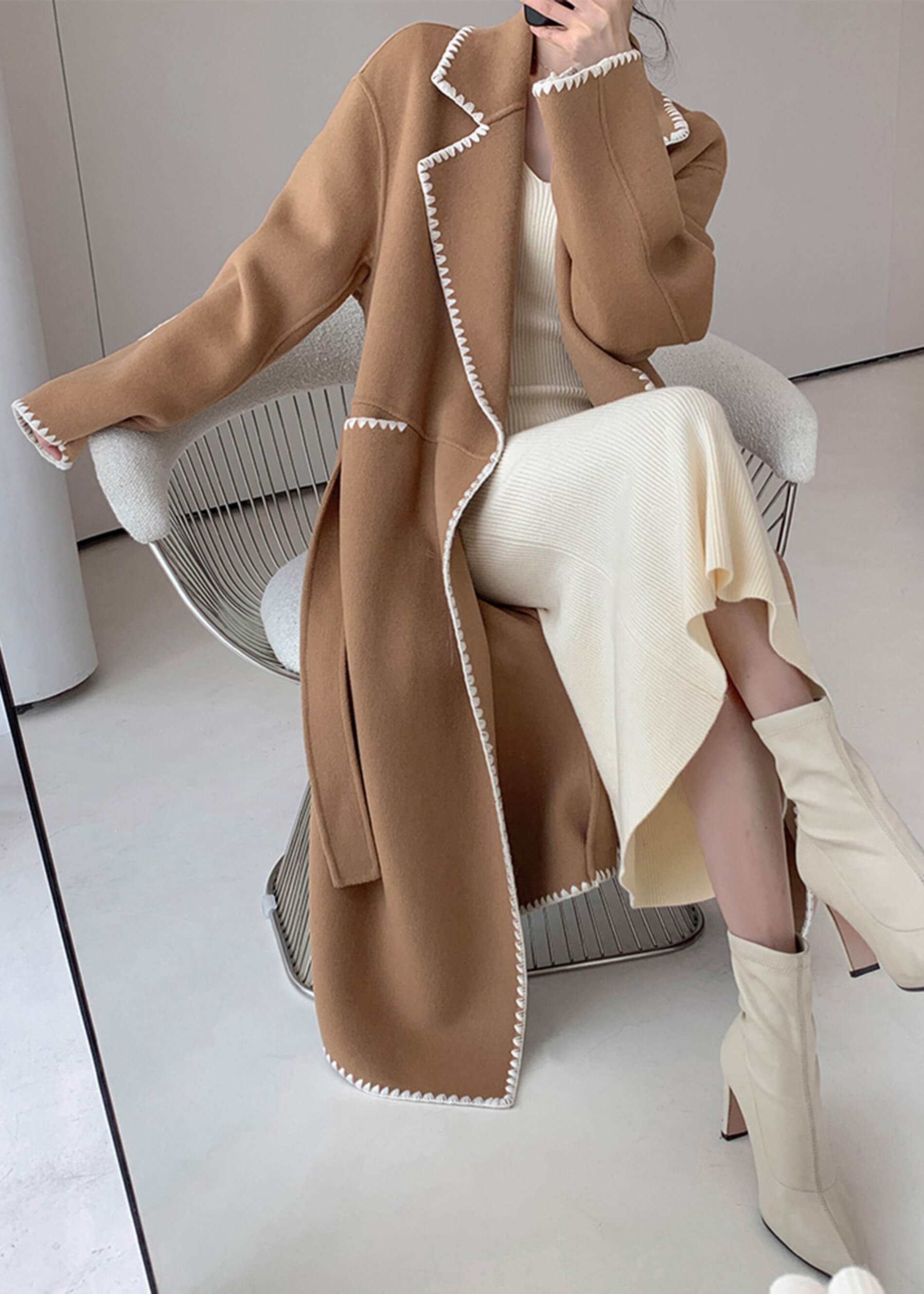 Classically crafted with a luxurious wool blend, this belted women's long coat features a shawl collar and is accented with two-tone toothed hem details, delivering sophisticated elegance in perfect harmony.