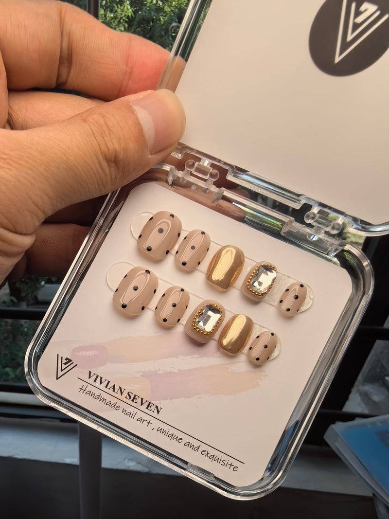 The entire production process is carried out by hand. It primarily involves intricate hand painting, starting with careful nail polishing, followed by the application of base gel, double layers of nail polish gel, and the addition of other elements such as magic mirror powder, fine line drawing gel and sculpting gel, depending on the design. Finally, the nails are reinforced and sealed to ensure long-lasting perfection.